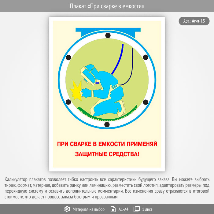 Плакат «При сварке в емкости» (Агит-13, 1 лист) в Кызыле купить