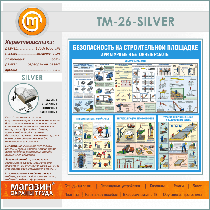 Стенд «Безопасность на строительной площадке. Арматурные и бетонные работы» (TM-26-SILVER) в Кызыле купить