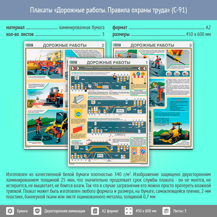 Плакаты «Дорожные работы. Правила охраны труда» (С-91, ламинированная бумага, А2, 3 листа) в Кызыле купить