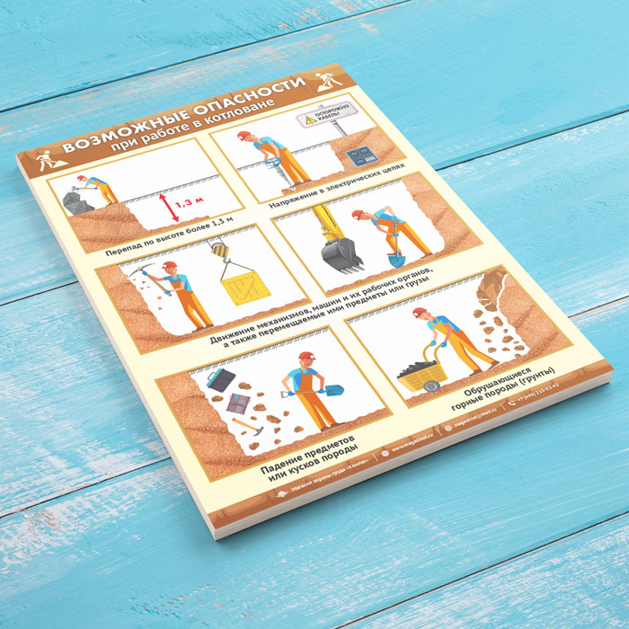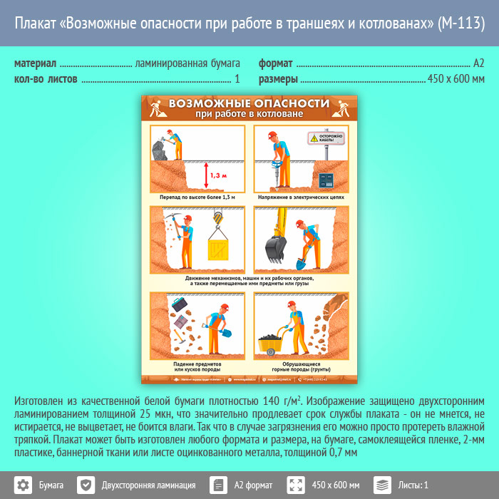 Плакат «Возможные опасности при работе в траншеях и котлованах» (М-113, ламинированная бумага, А2, 1 лист) в Кызыле купить