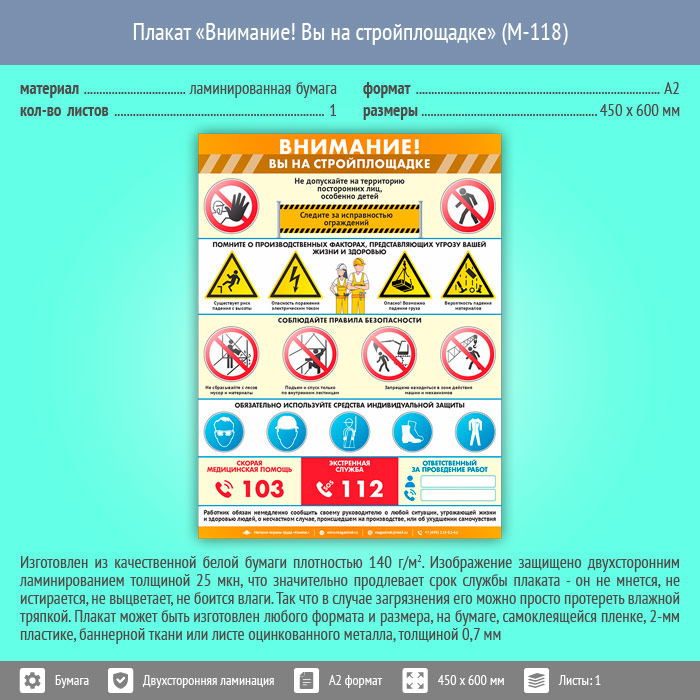 Плакат «Внимание! Вы на стройплощадке» (М-118, ламинированная бумага, А2, 1 лист) в Кызыле купить