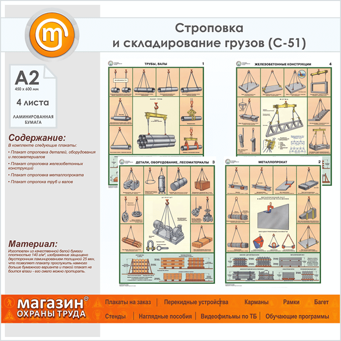 Плакаты «Строповка и складирование грузов» (С-51, ламинированная бумага, А2, 4 листа) в Кызыле купить