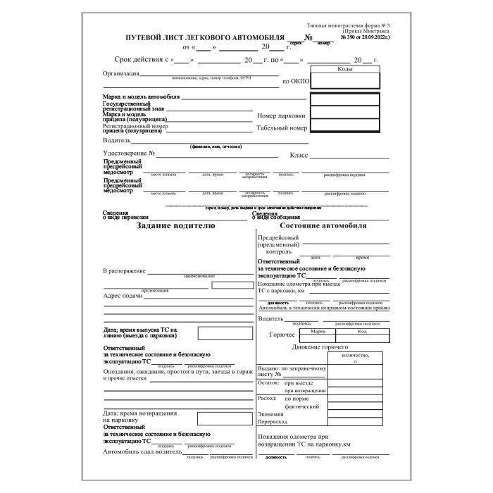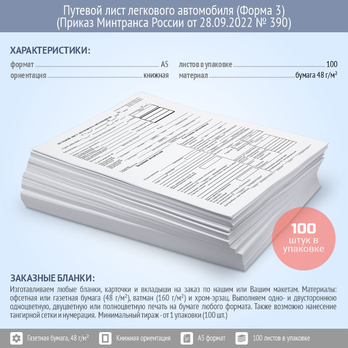 Путевой лист легкового автомобиля (Форма № 3) (Приказ Минтранса России от 28.09.2022 № 390) (упаковка из 100 штук) в Кызыле купить