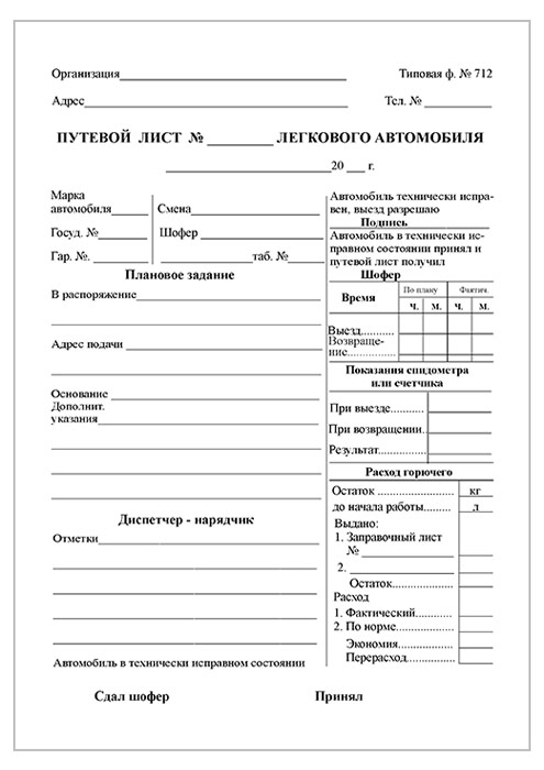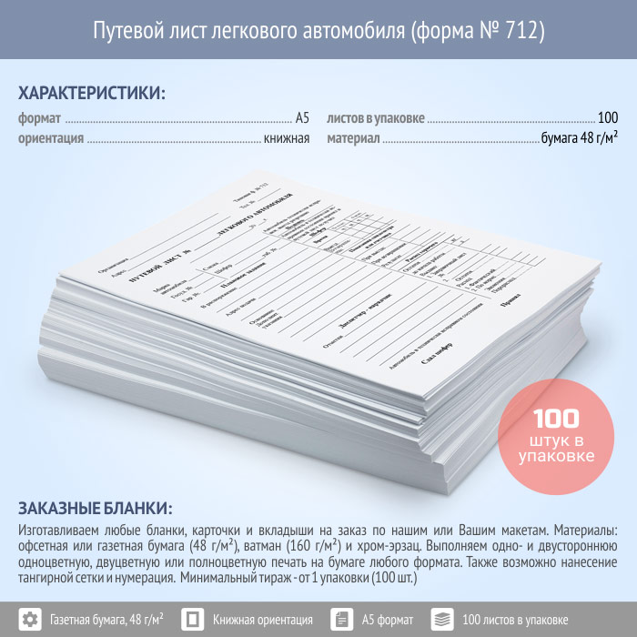 Путевой лист легкового автомобиля (форма № 712, упаковка из 100 штук) в Кызыле купить