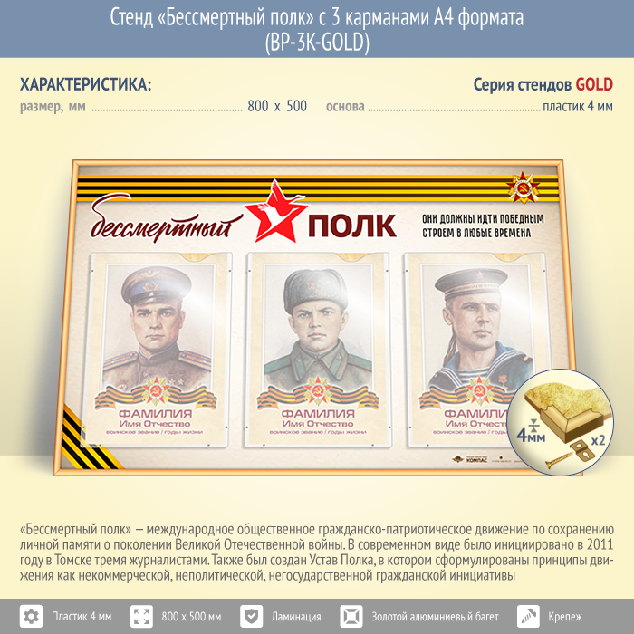 Стенд «Бессмертный полк» с 3 карманами А4 формата (BP-3K-GOLD) в Кызыле купить
