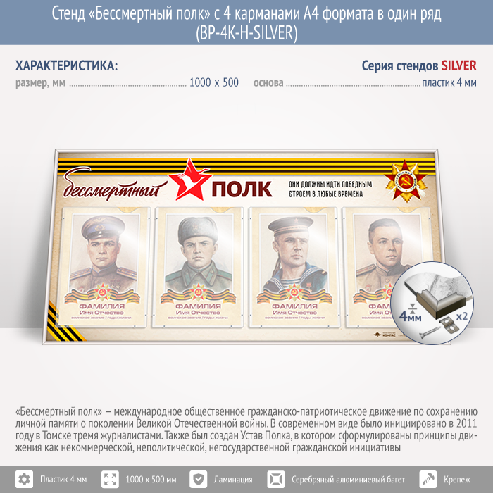 Стенд «Бессмертный полк» с 4 карманами А4 формата в один ряд (BP-4K-H-SILVER) в Кызыле купить