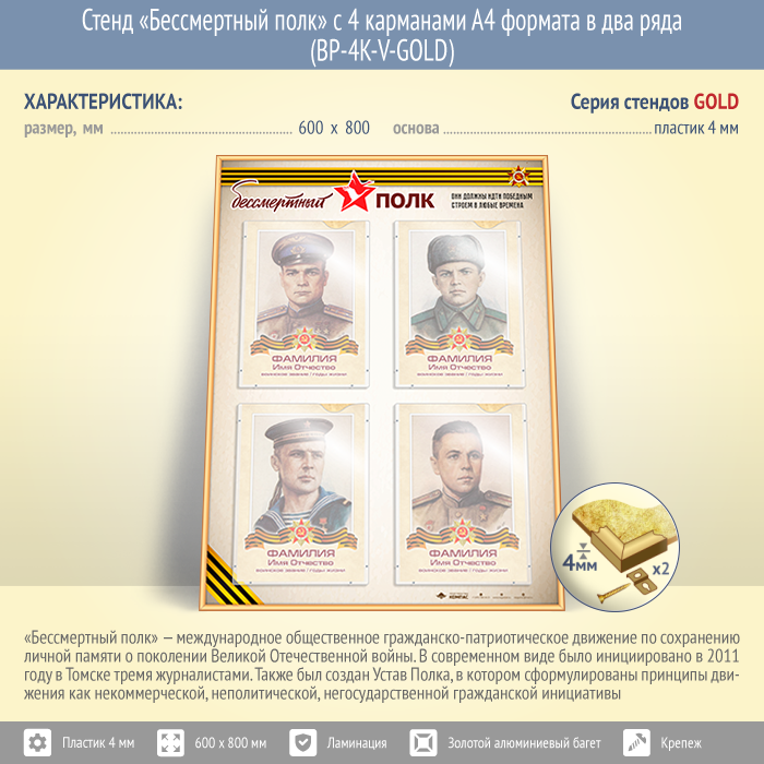 Стенд «Бессмертный полк» с 4 карманами А4 формата в два ряда (BP-4K-V-GOLD) в Кызыле купить