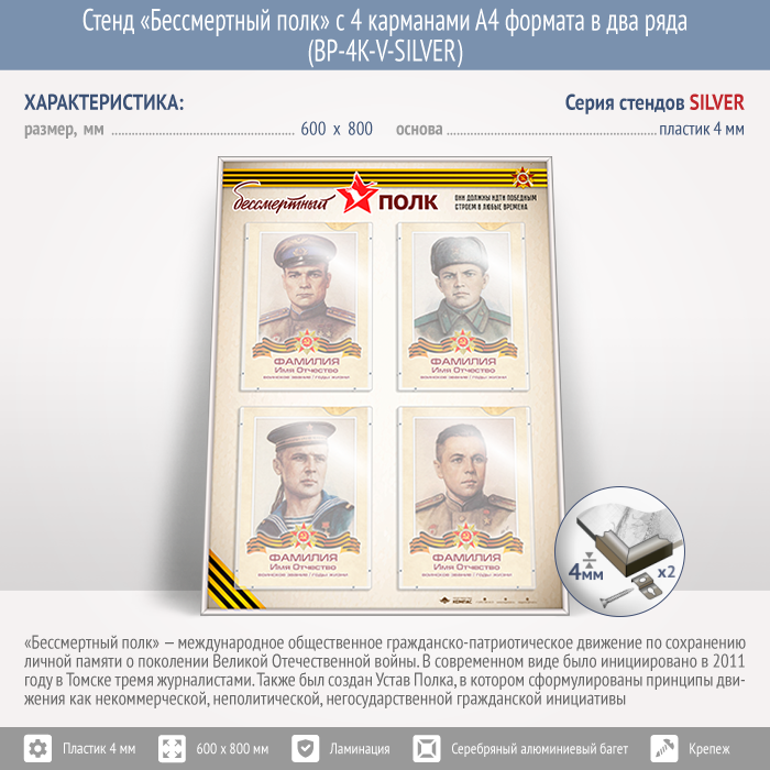 Стенд «Бессмертный полк» с 4 карманами А4 формата в два ряда (BP-4K-V-SILVER) в Кызыле купить