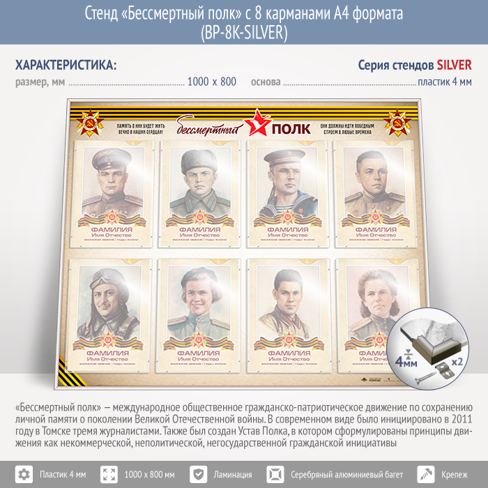 Стенд «Бессмертный полк» с 8 карманами А4 формата (BP-8K-SILVER) в Кызыле купить