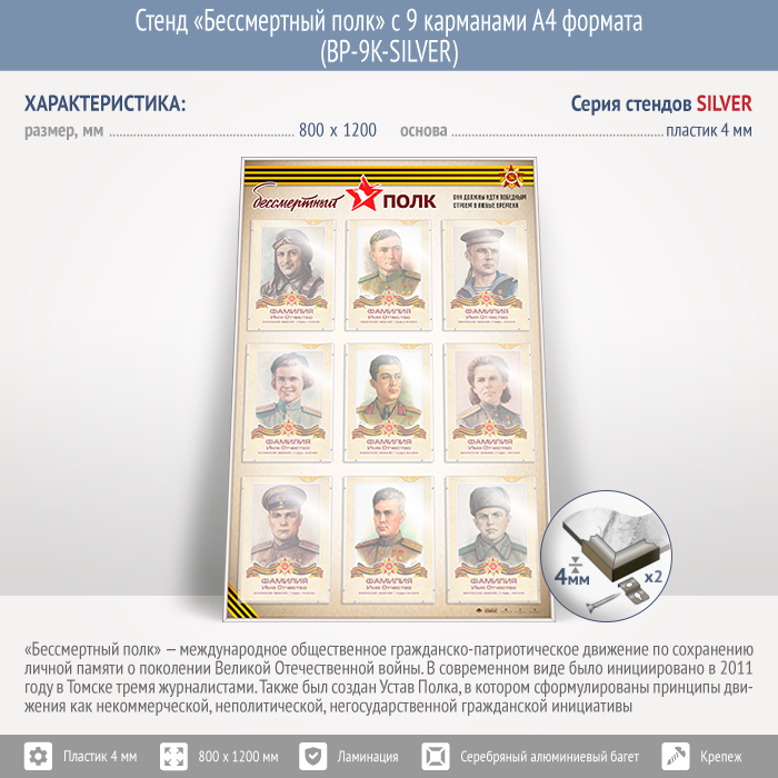 Стенд «Бессмертный полк» с 9 карманами А4 формата (BP-9K-SILVER) в Кызыле купить