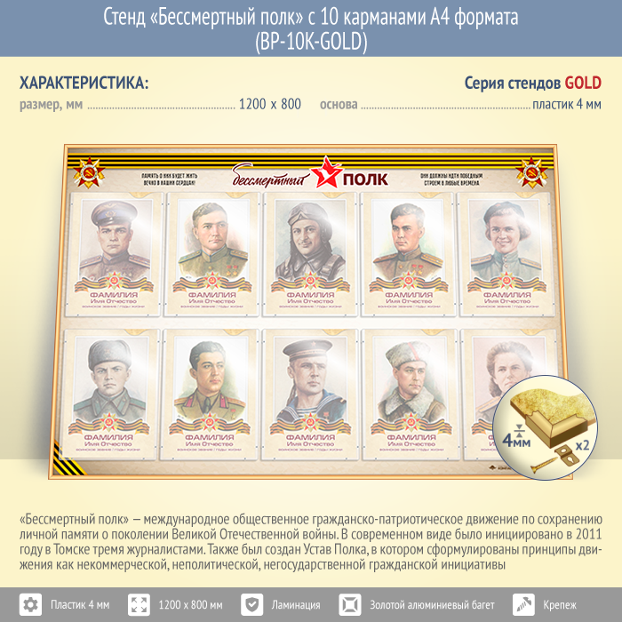 Стенд «Бессмертный полк» с 10 карманами А4 формата (BP-10K-GOLD) в Кызыле купить