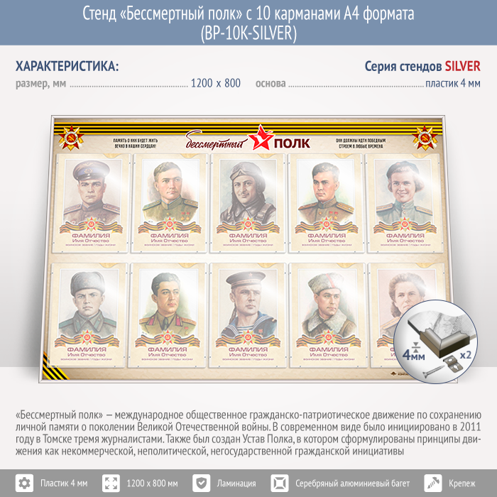 Стенд «Бессмертный полк» с 10 карманами А4 формата (BP-10K-SILVER) в Кызыле купить