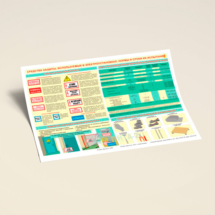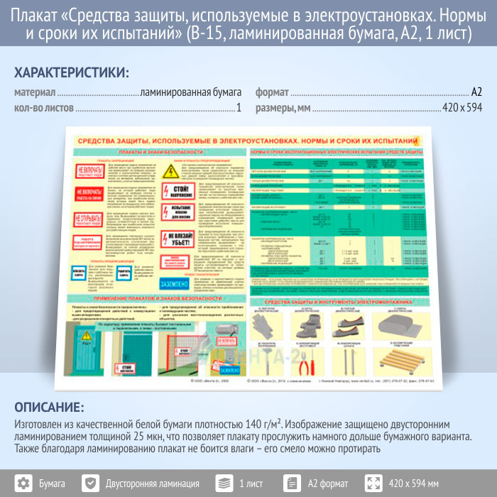 Плакат «Средства защиты, используемые в электроустановках. Нормы и сроки их испытаний» (В-15, ламинированная бумага, А2, 1 лист) в Кызыле купить