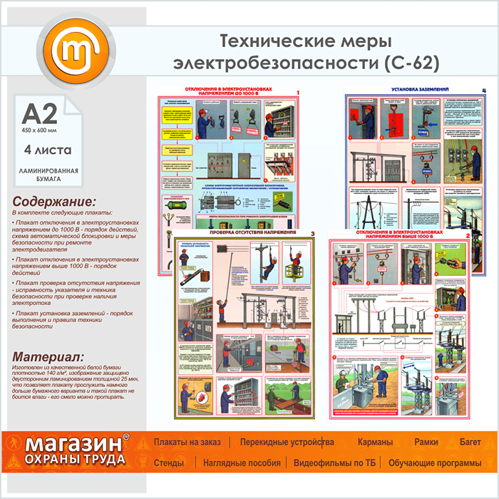 Плакаты «Технические меры электробезопасности» (С-62, ламинированная бумага, А2, 4 листа) в Кызыле купить