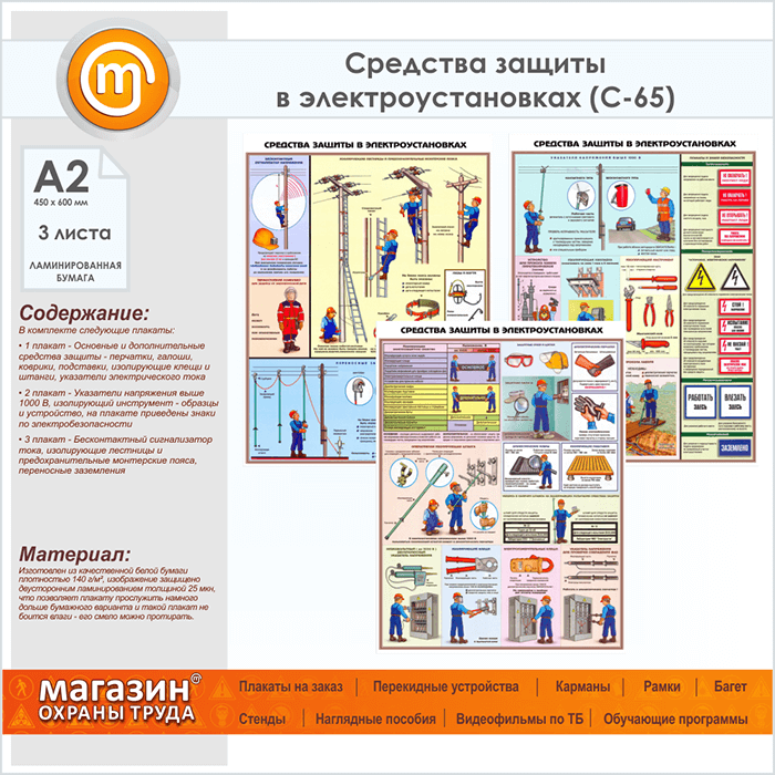 Плакаты «Средства защиты в электроустановках» (С-65, ламинированная бумага, А2, 3 листа) в Кызыле купить