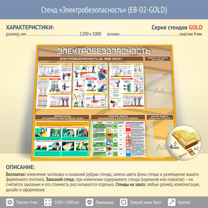 Стенд «Электробезопасность до 1000 вольт» с плоским и объемным карманами (EB-02-GOLD) в Кызыле купить