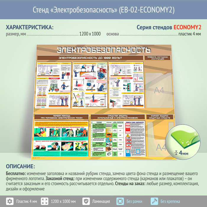 Стенд «Электробезопасность до 1000 вольт» с плоским и объемным карманами (EB-02-ECONOMY2) в Кызыле купить