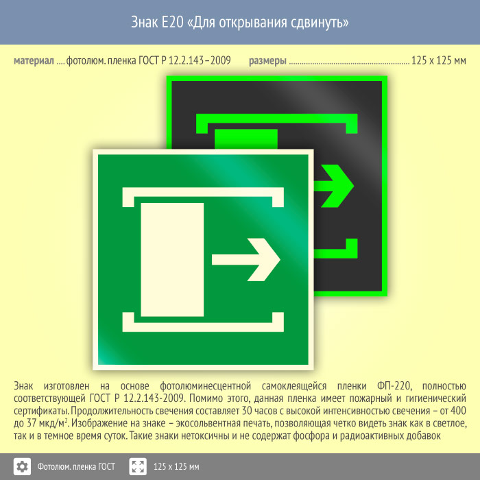 Знак E20 «Для открывания сдвинуть» (фотолюминесцентная пленка ГОСТ 34428-2018, 125х125 мм) в Кызыле купить