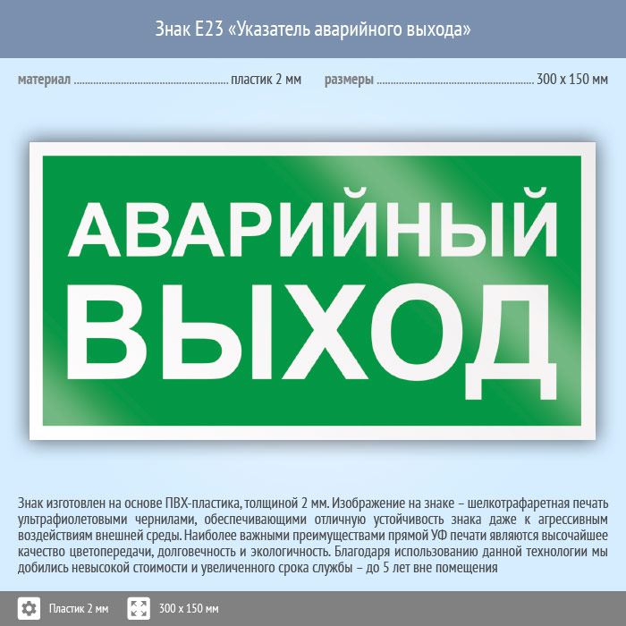 Знак E23 «Указатель аварийного выхода» (пластик, 300х150 мм) в Кызыле купить