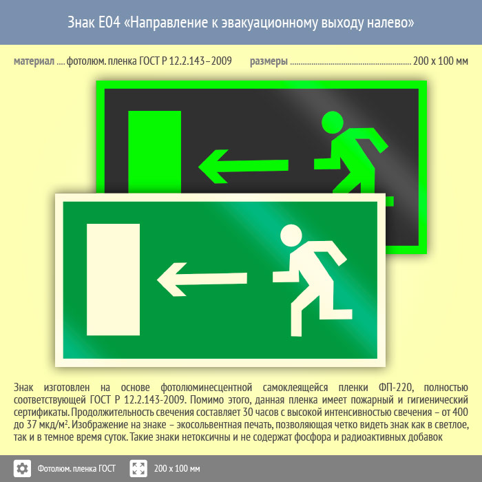 Знак E04 «Направление к эвакуационному выходу налево» (фотолюминесцентная пленка ГОСТ 34428-2018, 200х100 мм) в Кызыле купить