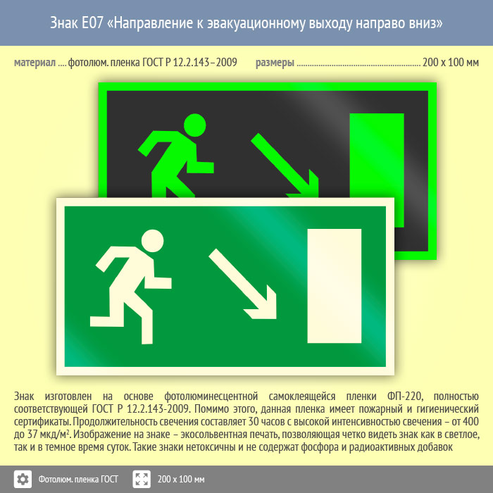 Знак E07 «Направление к эвакуационному выходу направо вниз» (фотолюминесцентная пленка ГОСТ 34428-2018, 200х100 мм) в Кызыле купить