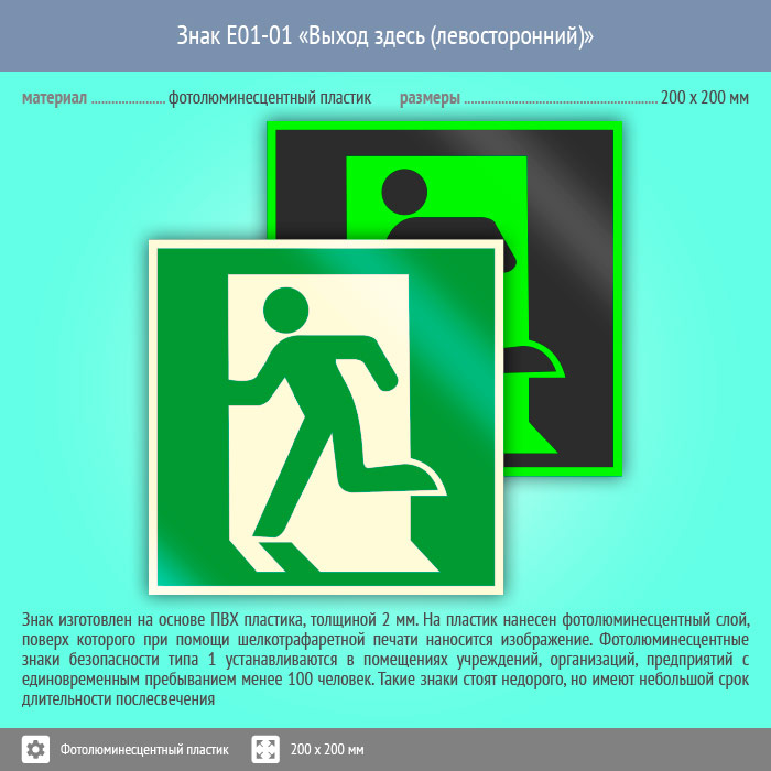 Знак E01-01 «Выход здесь (левосторонний)» (фотолюминесцентный пластик, 200х200 мм) в Кызыле купить