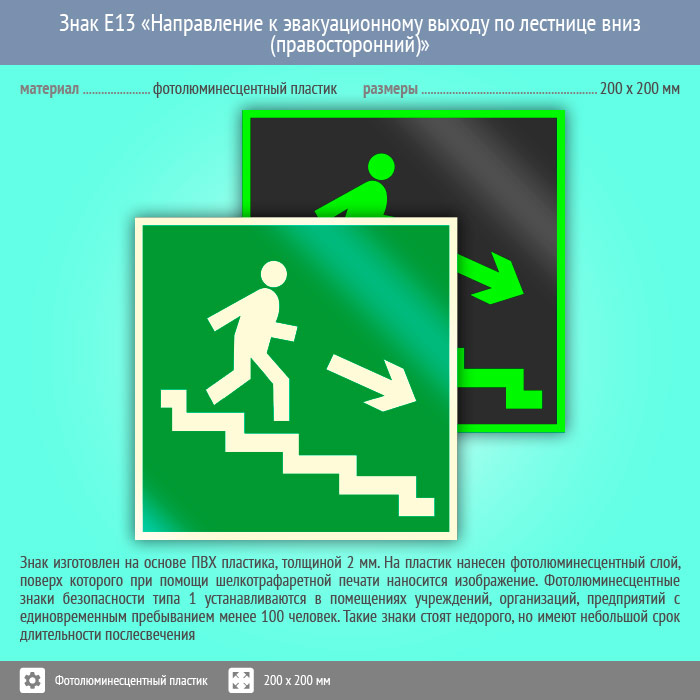 Знак E13 «Направление к эвакуационному выходу по лестнице вниз (правосторонний)» (фотолюминесцентный пластик, 200х200 мм) в Кызыле купить