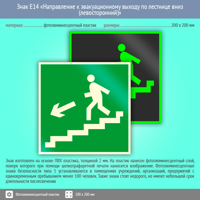 Знак E14 «Направление к эвакуационному выходу по лестнице вниз (левосторонний)» (фотолюминесцентный пластик, 200х200 мм) в Кызыле купить