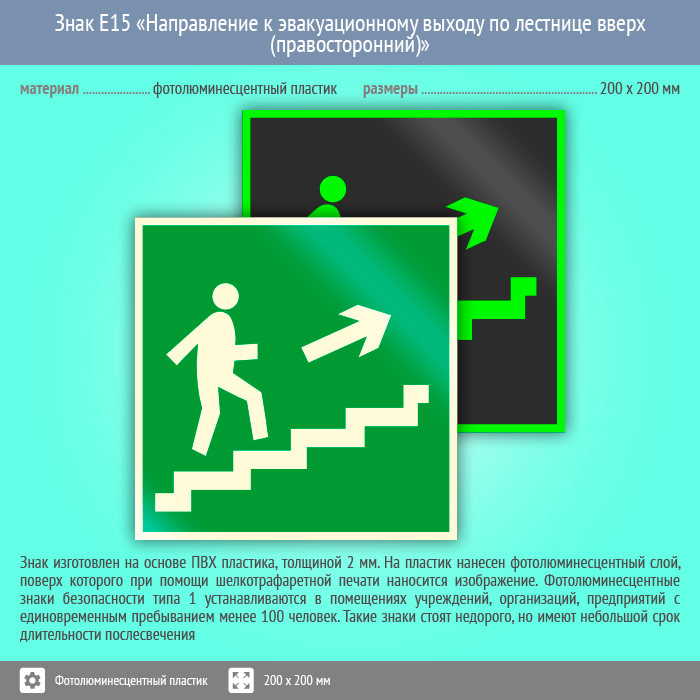 Знак E15 «Направление к эвакуационному выходу по лестнице вверх (правосторонний)» (фотолюминесцентный пластик, 200х200 мм) в Кызыле купить