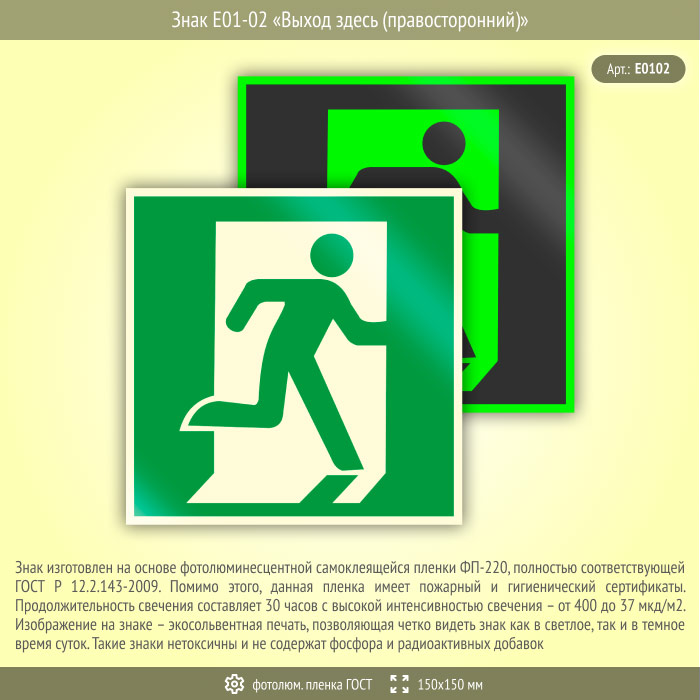 Знак E01-02 «Выход здесь (правосторонний)» (фотолюминесцентная пленка ГОСТ 34428-2018, 150х150 мм) в Кызыле купить