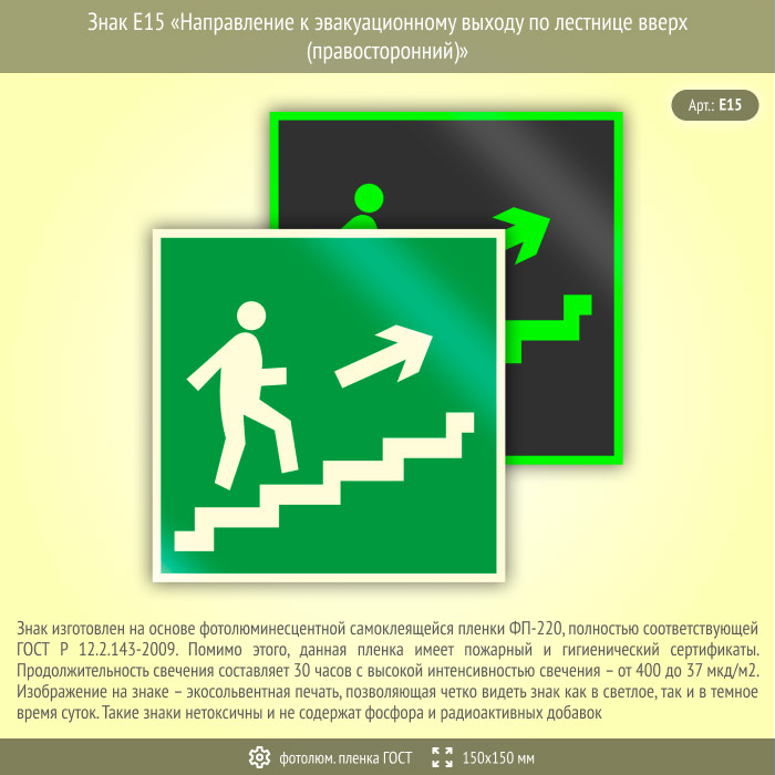 Знак E15 «Направление к эвакуационному выходу по лестнице вверх (правосторонний)» (фотолюминесцентная пленка ГОСТ 34428-2018, 150х150 мм) в Кызыле купить