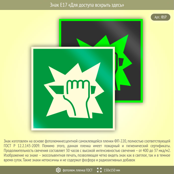 Знак E17 «Для доступа вскрыть здесь» (фотолюминесцентная пленка ГОСТ 34428-2018, 150х150 мм) в Кызыле купить