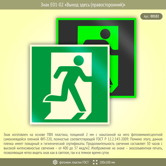 Знак E01-02 «Выход здесь (правосторонний)» (фотолюминесцентный пластик ГОСТ 34428-2018, 100х100 мм) в Кызыле купить