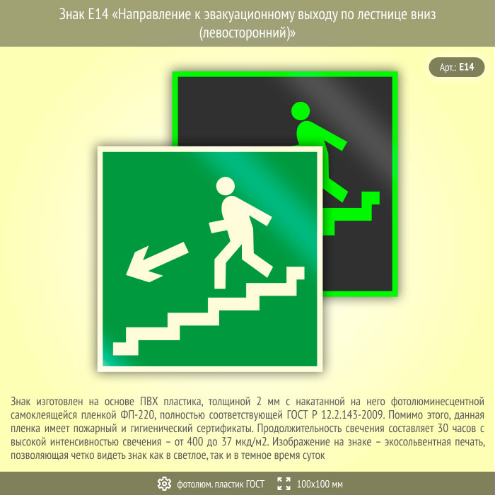 Знак E14 «Направление к эвакуационному выходу по лестнице вниз (левосторонний)» (фотолюминесцентный пластик ГОСТ 34428-2018, 100х100 мм) в Кызыле купить