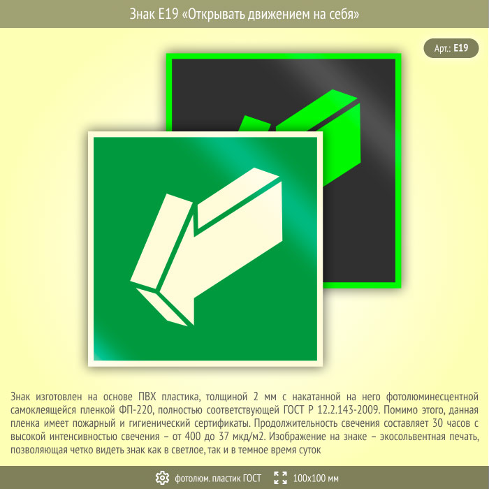 Знак E19 «Открывать движением на себя» (фотолюминесцентный пластик ГОСТ 34428-2018, 100х100 мм) в Кызыле купить