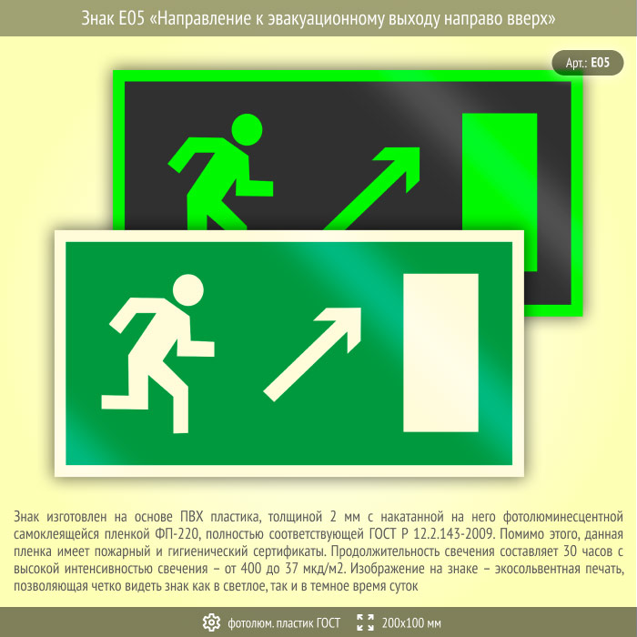 Знак E05 «Направление к эвакуационному выходу направо вверх» (фотолюминесцентный пластик ГОСТ 34428-2018, 200х100 мм) в Кызыле купить