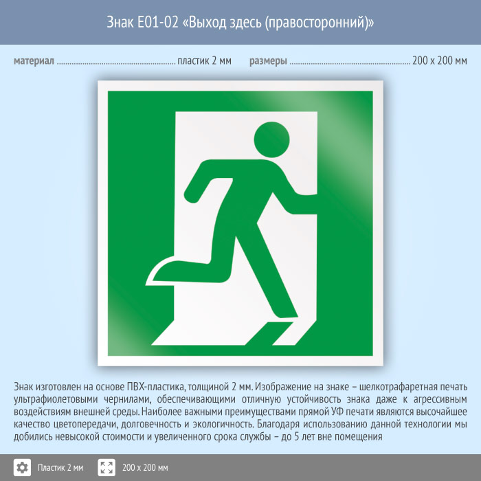 Знак E01-02 «Выход здесь (правосторонний)» (пластик, 200х200 мм) в Кызыле купить