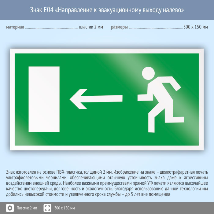 Знак E04 «Направление к эвакуационному выходу налево» (пластик, 300х150 мм) в Кызыле купить