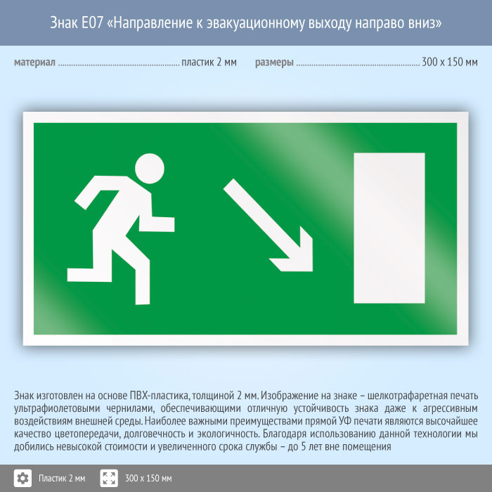 Знак E07 «Направление к эвакуационному выходу направо вниз» (пластик, 300х150 мм) в Кызыле купить