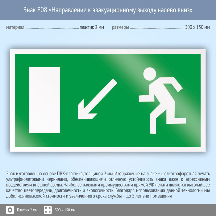 Знак E08 «Направление к эвакуационному выходу налево вниз» (пластик, 300х150 мм) в Кызыле купить