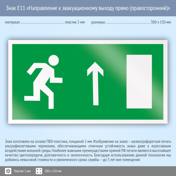 Знак E11 «Направление к эвакуационному выходу прямо (правосторонний)» (пластик, 300х150 мм) в Кызыле купить