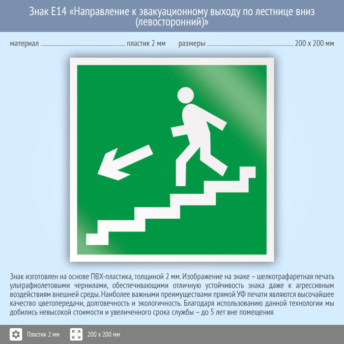 Знак E14 «Направление к эвакуационному выходу по лестнице вниз (левосторонний)» (пластик, 200х200 мм) в Кызыле купить