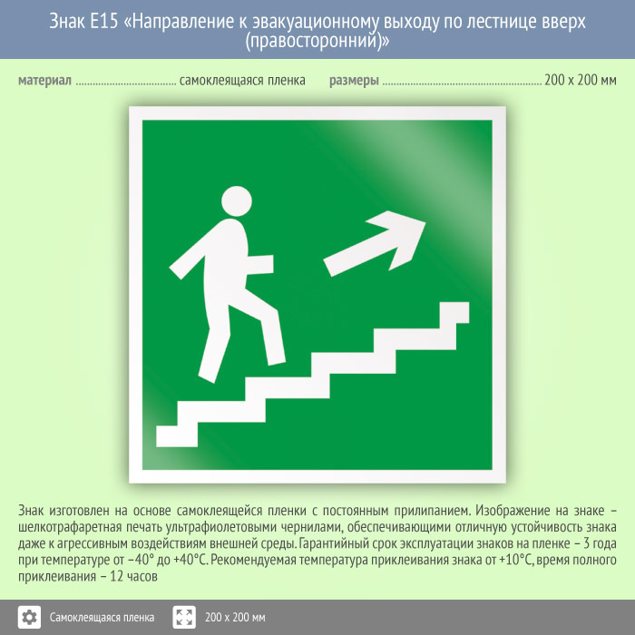 Знак E15 «Направление к эвакуационному выходу по лестнице вверх (правосторонний)» (пленка, 200х200 мм) в Кызыле купить