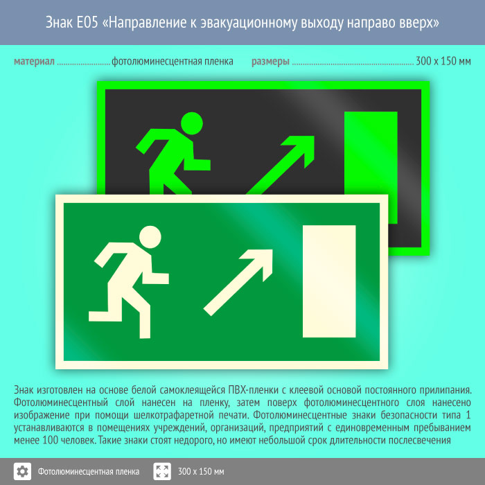 Знак E05 «Направление к эвакуационному выходу направо вверх» (фотолюминесцентная пленка, 300х150 мм) в Кызыле купить