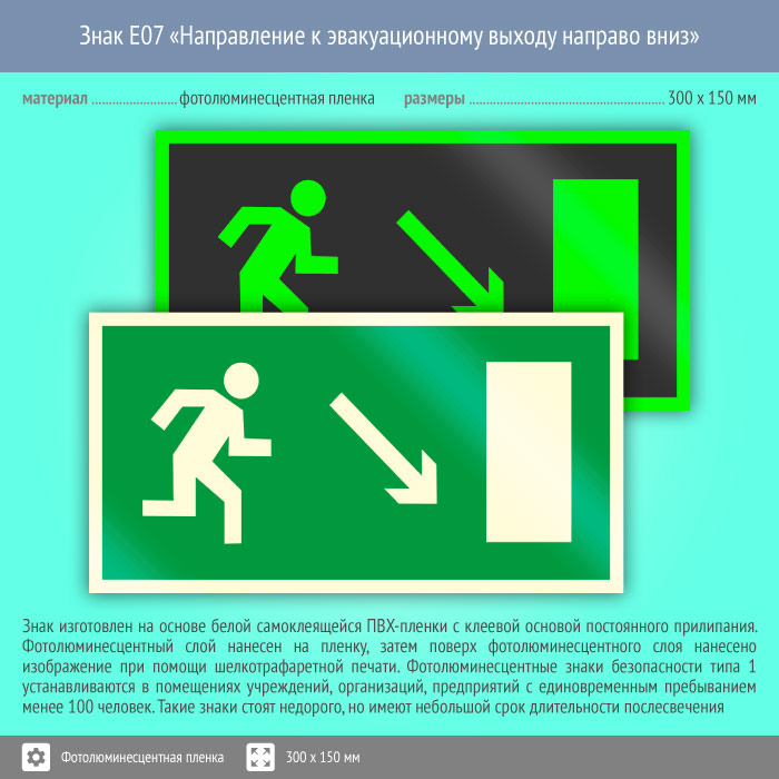 Знак E07 «Направление к эвакуационному выходу направо вниз» (фотолюминесцентная пленка, 300х150 мм) в Кызыле купить
