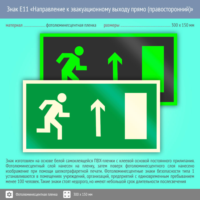 Знак E11 «Направление к эвакуационному выходу прямо (правосторонний)» (фотолюминесцентная пленка, 300х150 мм) в Кызыле купить