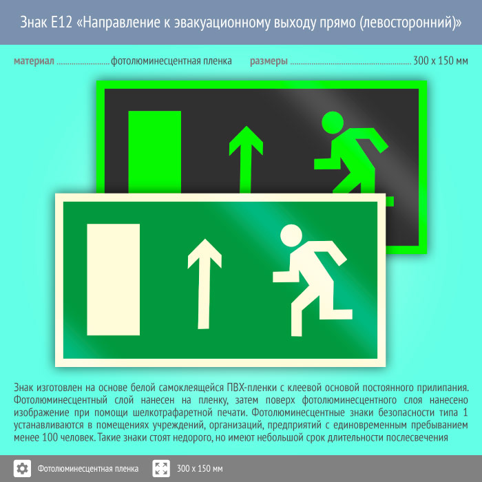 Знак E12 «Направление к эвакуационному выходу прямо (левосторонний)» (фотолюминесцентная пленка, 300х150 мм) в Кызыле купить