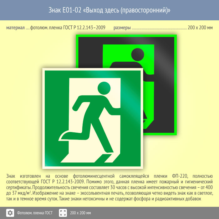 Знак E01-02 «Выход здесь (правосторонний)» (фотолюминесцентная пленка ГОСТ 34428-2018, 200х200 мм) в Кызыле купить