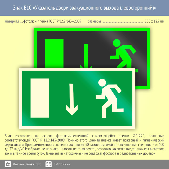 Знак E10 «Указатель двери эвакуационного выхода (левосторонний)» (фотолюминесцентная пленка ГОСТ 34428-2018, 250х125 мм) в Кызыле купить