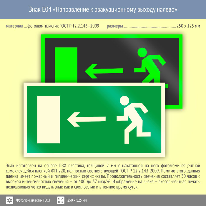 Знак E04 «Направление к эвакуационному выходу налево» (фотолюминесцентный пластик ГОСТ 34428-2018, 250х125 мм) в Кызыле купить